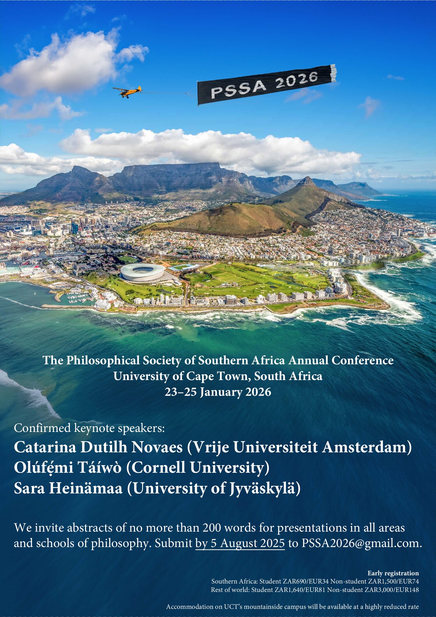 The Philosophical Society of Southern Africa Annual Conference takes place at the University of Cape Town, 23–25 January 2026. Please see poster attached.